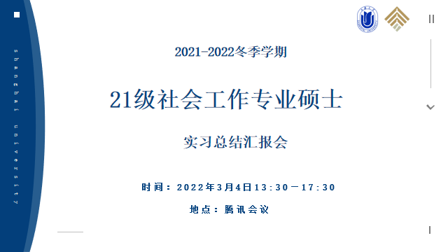 2022年3月4日,ok138cn太阳集团古天乐2021级社会工作专业硕士冬季学期实习总结汇报会顺利举行。社会工作系程明明主任、阳方副主任、华红琴副教授、陈佳博士、张天明博士、陈慧菁博士、赵宇阳博士以及全体21级社会工作硕士研究生50名同学出席会议,会议分两组同步线上进行,分别由陈彩霞老师和程金老师主持。
