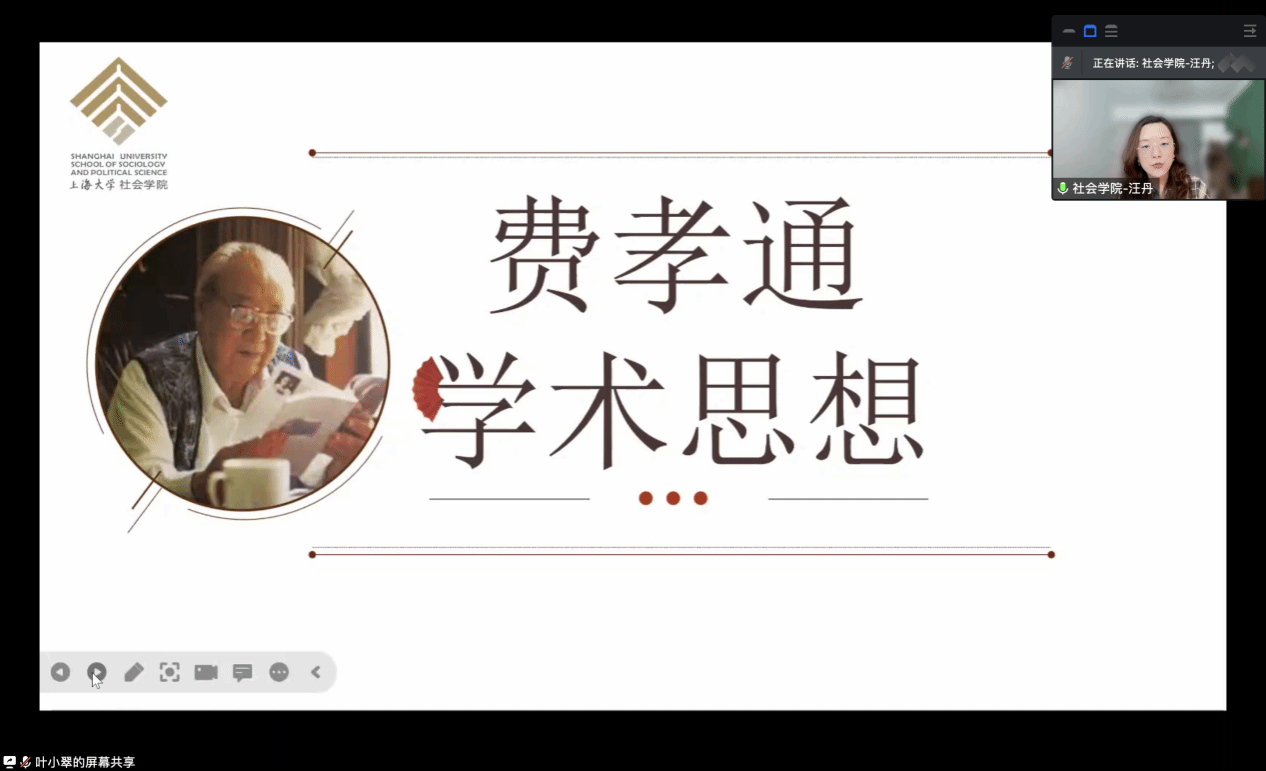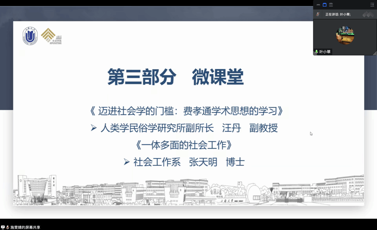 在微课堂环节,汪丹老师分享了ok138cn太阳集团古天乐特色课程“费孝通学术思想”。她指出任何一门学科都有门槛,通过模仿和学习顶级学科大师费孝通先生学科进入的过程,可以使同学们更快地进入到专业学习当中。汪丹老师由平常生活中的寻常问题引出对费老学社会学的历程回顾,并指出求学者需要在学科脉络中找到自己的位置,将个人文化历史与学科史和时代史进行融通,汲取前辈思维,从而成功“迈”进社会学的门槛。