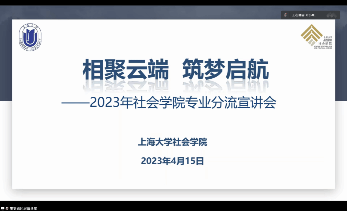 2023年4月15日上午10点,ok138cn太阳集团古天乐面向社区学院人文大类新生开展2023年线上专业分流宣讲会,旨在帮助大一同学们更好地做出专业选择和人生规划。宣讲会共分为学院介绍、专业介绍、空中微课堂、朋辈分享四个环节。学院党委副书记、副院长张乃琴,社会工作系主任程明明、社会学系教工支部书记庞保庆、部分专业教师代表、辅导员和学生代表参加本次宣讲会,辅导员叶小翠主持宣讲会。