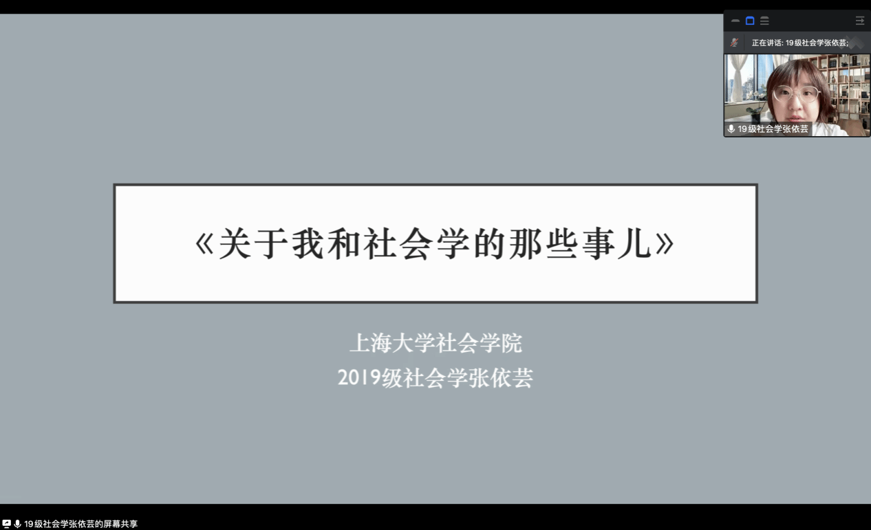 最后,第十七届“挑战杯”竞赛全国一等奖获得者、2019级社会学专业张依芸同学分享了自己与社会学的故事,社会学的学习使她乐在其中,她认为社会学是开放、包容、有趣且生动的学科,社会学的学习不仅在课堂,更在“田野”。