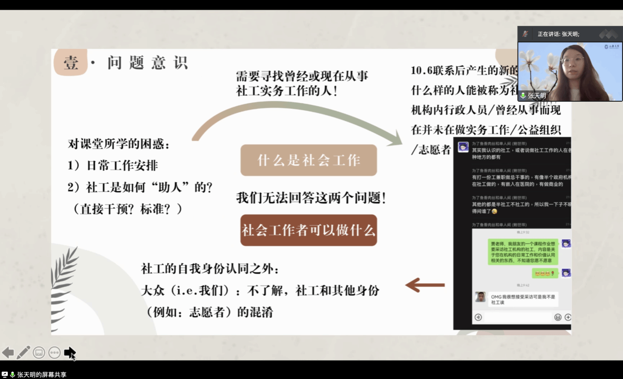 张天明老师展示了“一体多面的社会工作”。她表示,相比于社会学的研究问题,社会工作致力于解决问题,通过真实的行动来改变社会的现状。她分通过分析《唐社工的故事》的短视,频使同学们了解到社会工作者不仅是心地善良的人,更是受过教育的专业人士。在进入社工专业学习后,同学们将会深入学习到如何与人沟通,如何撬开服务对象的心门等相关专业的方法和技巧。