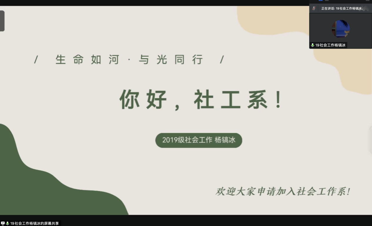 2019级社会工作系本科生杨镐冰同学分享了社会工作专业第一课的关键词——“生命影响生命”、“利他主义”、“助人自助”等等,让同学们对社会工作专业有了更直观的认知。在社工的专业课堂上,同学们不仅能够见识政策、习得方法,更能学会同理他人、认知自己。