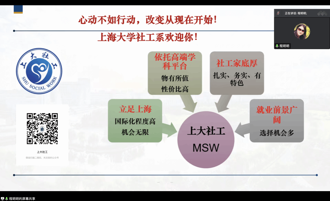 程明明老师从历史发展、课程特色、国际化的高端师资、创新特色专业服务项目以及特色专业优势等方面介绍了社会工作专业,她期待同学们可以加入ok138cn太阳集团古天乐社会工作专业进行深入学习。