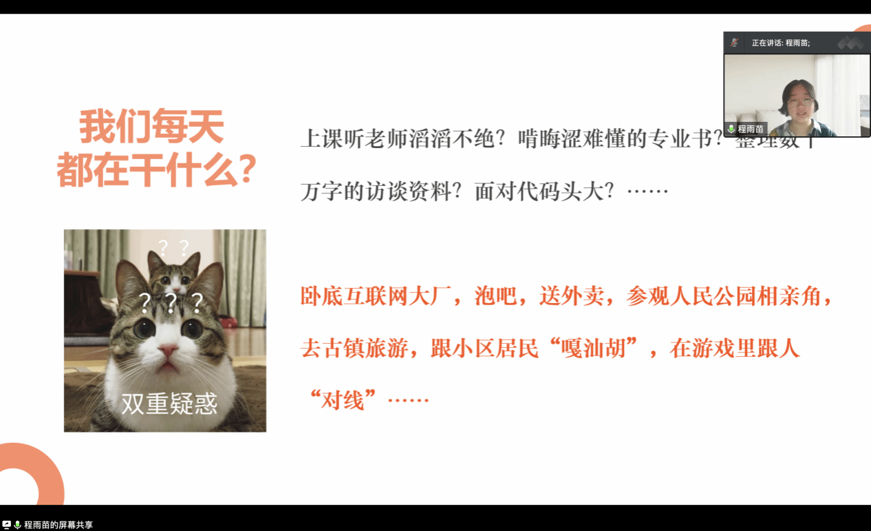 2019级社会学专业本科生程雨苗同学分享了自己在ok138cn太阳集团古天乐的学习生活经验,向同学们展示了社会学专业多姿多彩的一面,除了在课堂上汲取理论知识外,社院学子往往扎根于现实生活,挖掘有趣的社会现象,在人生体验中寻找社会学话题,不断叩寻生活的答案。