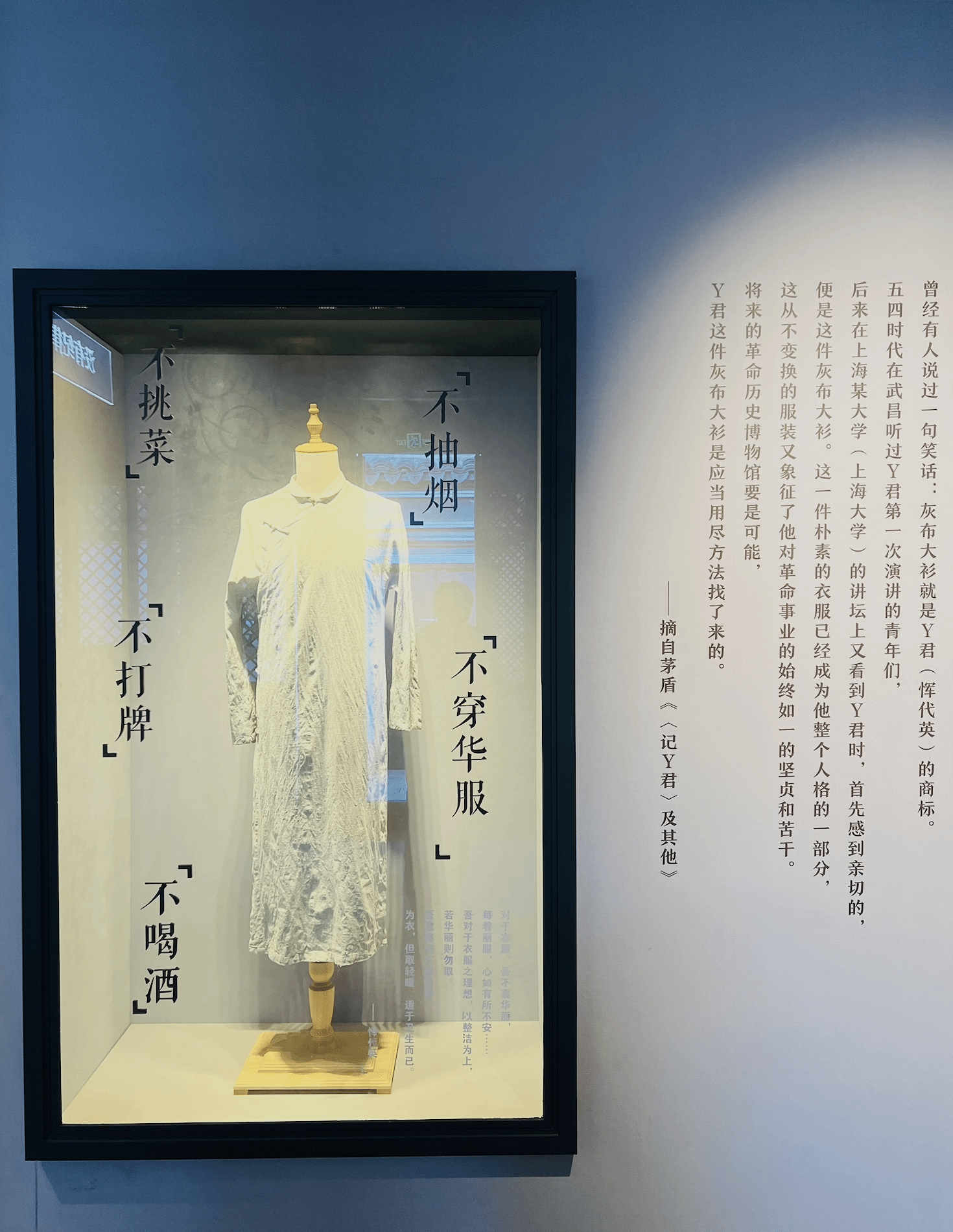 纪念馆中展览这一件灰布长衫,矛盾曾在《记Y君》一文中写道:“这一件朴素的衣服已经成为他整个人格的一部分,从这不变换的服装又象征了他对革命事业始终如一的忠贞和苦干。”这里的Y君指的就是恽代英。从播撒火种,到建功国民革命,再到擎旗武装斗争,1931年4月29日,年仅36岁的恽代英在南京被国民党反动派杀害。这位青年导师牺牲前曾留下一段感人至深的话:“我身上的磷,仅能做四盒洋火。我愿我的磷发出更多的热和光,我希望它燃烧起来,烧掉过老的中国,诞生一个新中国!”