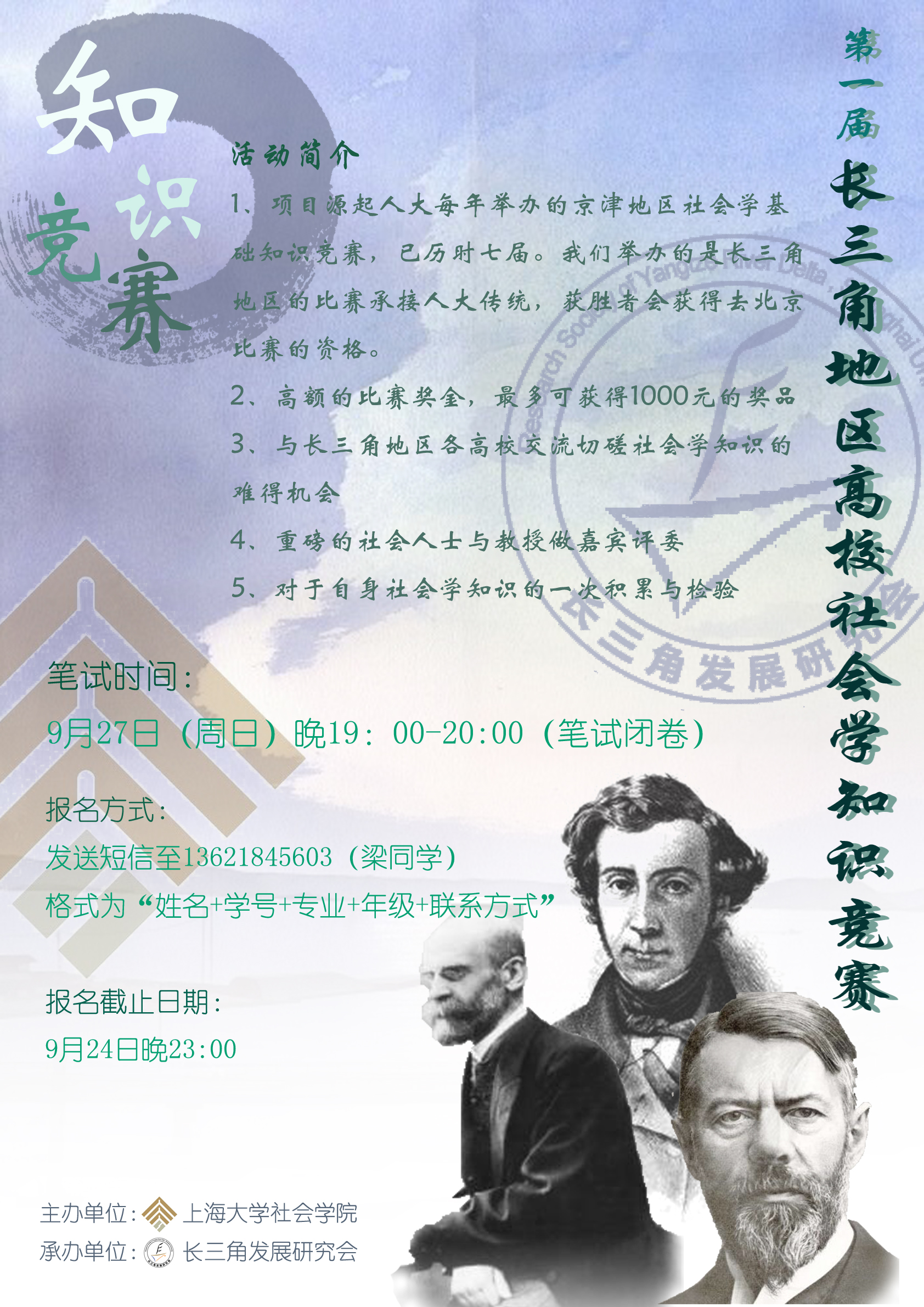 <div style="TEXT-INDENT: 21pt"><span style="FONT-SIZE: 10.5pt">竞赛将邀请长三角地区各开设社会学专业的高校选派优秀选手同台竞技,全面考察社会学基础知识、社会学研究方法基本知识和社会热点问题。</span></div>