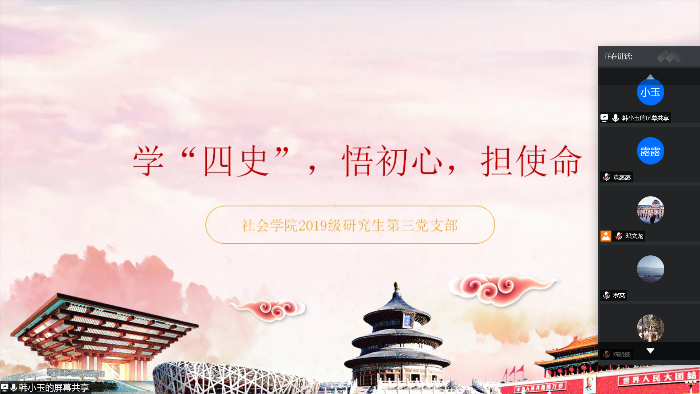 为积极响应习近平总书记“要学习党史、新中国史、改革开放史和社会主义发展史”的号召,2020年5月13日下午2点,2019级研究生第三党支部召开线上组织生活会。此次会议以“学四史,悟初心,担使命”为主题,由支部书记韩小玉主持,带领支部全体党员展开了关于四史的学习和讨论。