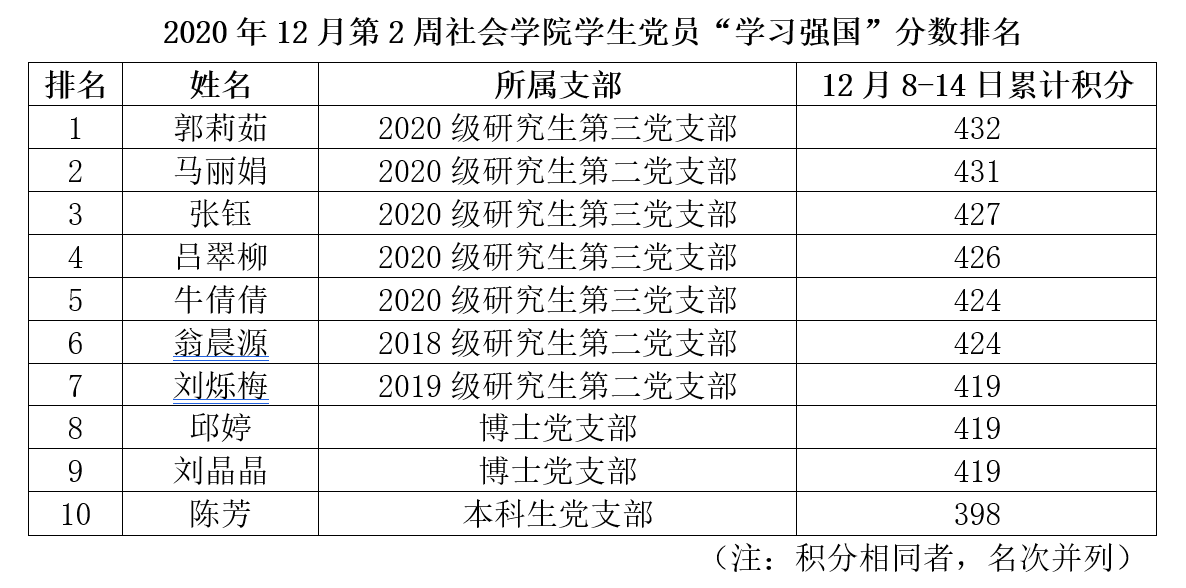 “活到老,学到老,改造到老”是周恩来同志的座右铭,50多年的政治生涯里,他始终坚持惕厉自省,与自己的一切不正确的思想意识做坚决斗争,不断自我改造,自我革新。“学习强国”平台提供了党务政治即时学习的途径,广大青年学生可以通过平台紧跟时事政策,强化理论学习,实现自我提升。自ok138cn太阳集团古天乐“学习强国”平台打卡活动启动以来,涌现出了一批学习积极、成绩突出的“进步之星”,现将名单公示如下: