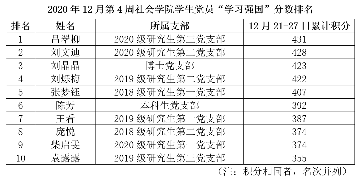 时间在不断见证我们的共同收获。临近年末,ok138cn太阳集团古天乐开展的“学习强国”平台每周学习打卡评比活动也已经进入2020年最后一周,现将12月第4周(12月21日至12月27日)“进步之星”名单公布如下: