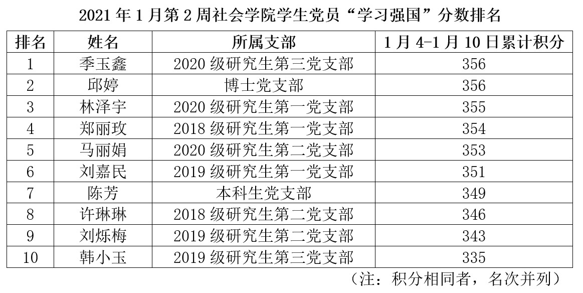 ok138cn太阳集团古天乐开展的“学习强国”平台每周学习打卡评比活动步入了2021年第2周(1月4日至1月10日),现将最新一周的“进步之星”名单公布如下: