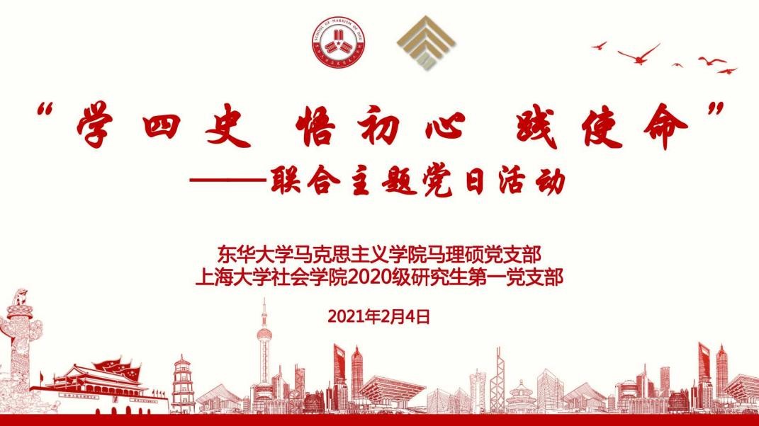 “百年征程波澜壮阔,百年初心历久弥坚。”2021年是中国共产党成立100周年,也是迈向全面建设社会主义现代化国家新征程的开局之年。当代青年作为建设社会主义现代化强国的主力军,责任重大,使命光荣。为进一步开展“四史”学习教育,2021年2月4日14时,ok138cn太阳集团古天乐2020级研究生第一党支部与东华大学马克思主义学院马理硕党支部联合开展“学‘四史’、悟初心、践使命”主题党日活动。两个支部的60余名成员通过线上会议的方式参与了本次活动。