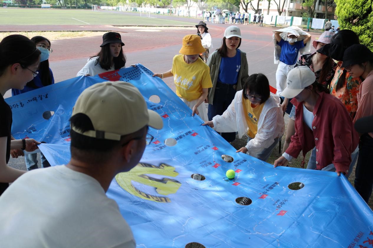 “万里长征”环节考验着团队的合作精神,各组成员需齐心协力让小球按画好的路线走并最终进洞。路线中一个个的小红旗标志着红军长征途中取得的一次次胜利,而画布之上随时令小球跌落的“陷阱”则诉说着途中的艰难险阻,“红军不怕远征难,万水千山只等闲”毛泽东主席《七律·长征》的一幕幕在脑海中浮现,通过游戏,参赛者充分体悟了坚韧不拔、自强不息、勇往直前的长征精神。