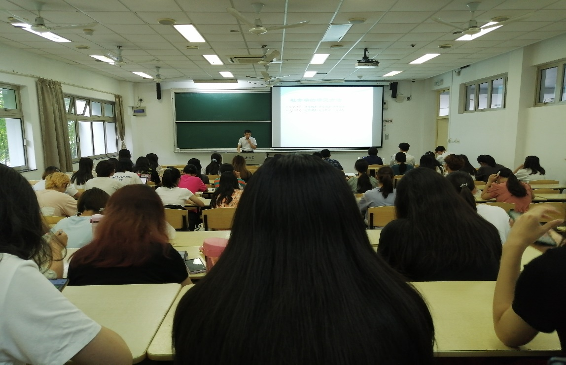首先,金桥老师为同学们科普了我国的社会调查传统派别、社会研究的方法论及其代表人物等社会学基础知识,让同学们对社会学研究的渊源与理论有了基本的认识。接着,他将理论与实际生活相结合,通过他自家至学校沿途的种种现象所具有的研究潜力,从选题的标准到研究人群的抽样,再到两种社会研究方法——定量与质性研究进行了详细分析。金桥老师清晰缜密的逻辑思路与温和的态度,将发生在我们身边的点滴小事贯穿学术理论学习中,使得学术性较强的专业内容变得浅显易懂又趣味横生,对于社会调查研究方法进行了初步的介绍,同学们沉浸于老师的讲解中,对于社会学的认识思考有所深入的同时,兴趣也愈发浓厚。