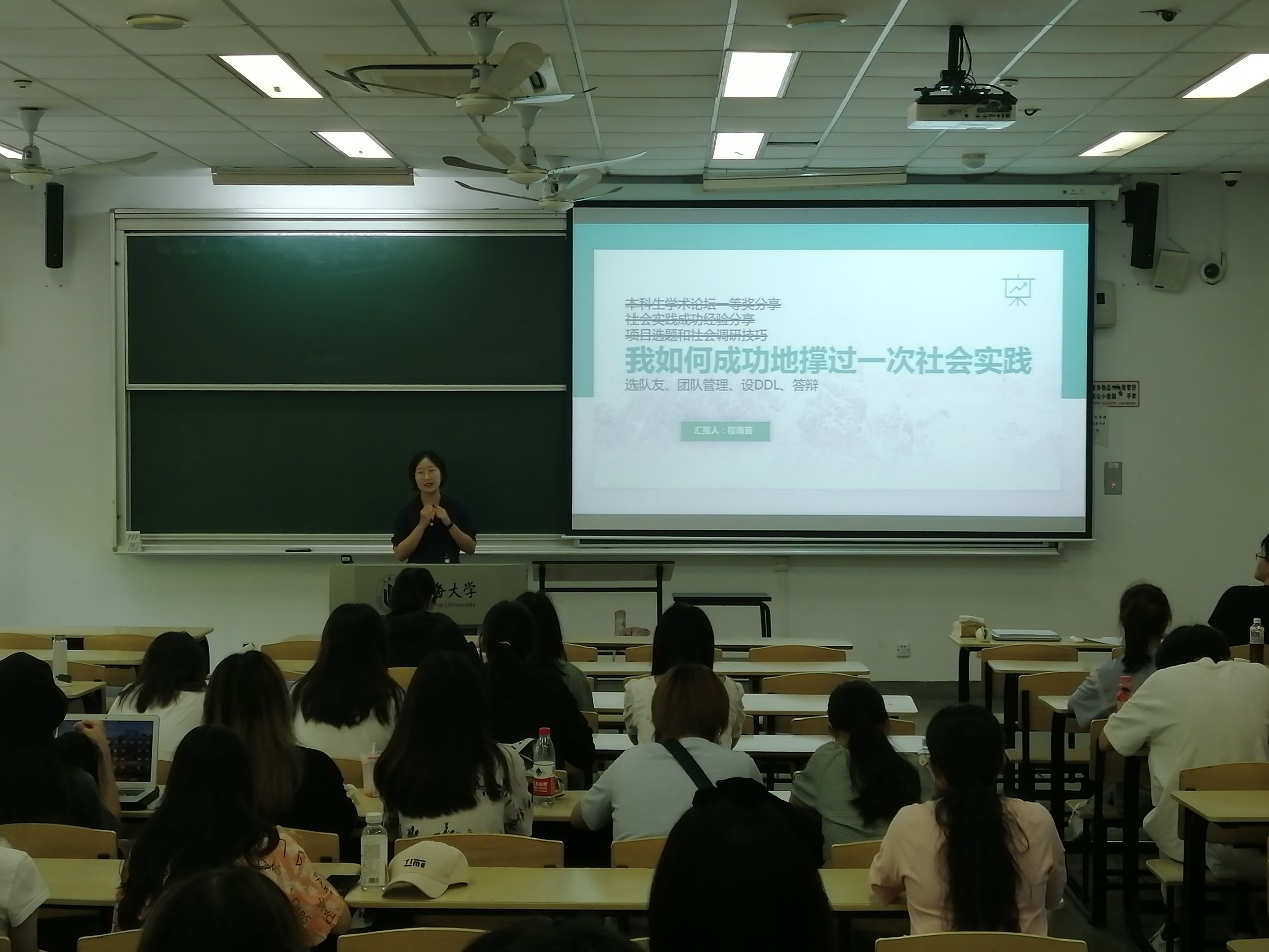 在经过了一个中午的休息调整后,同学们再次来到AJ104教室,由19级的导生程雨苗学姐向我们分享她参与本科生学术论坛和进行社会实践项目的具体经历。程雨苗学姐围绕她获得本科生论坛一等奖的经历,用幽默风趣的语言向我们讲述了她从选题、进行调研、撰写论文的大体过程以及其中的些许趣事,并在现场为我们再现了答辩的情景。