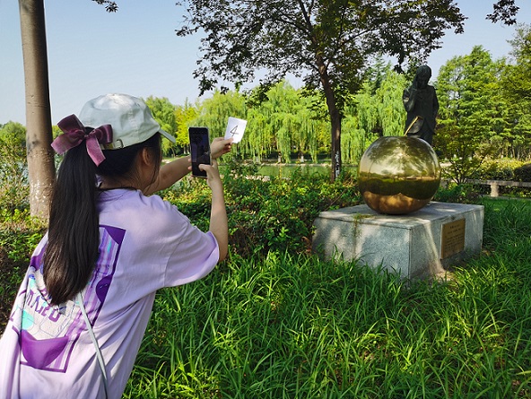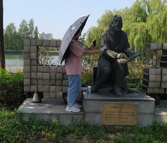 教学楼东侧泮池边的一组塑像也在我们探索上大的打卡物之列,那是物理学家牛顿和启发其探索万有引力的金苹果。牛顿微微颔首,作沉思状,身侧浑圆硕大的金苹果代表着人类极致的好奇心和创造力。这组雕像静默地立于青草掩映之下,以一种祥和而坚定的力量像青年学生们传递着探索和挑战自然之未知的决心。同学们给先贤的雕像拍照,感受人类对于真理的执着。