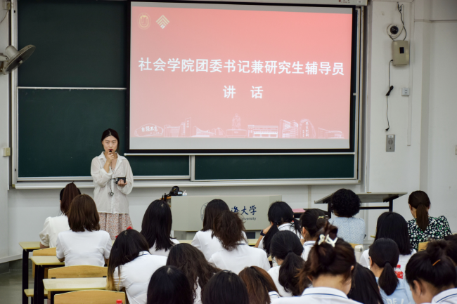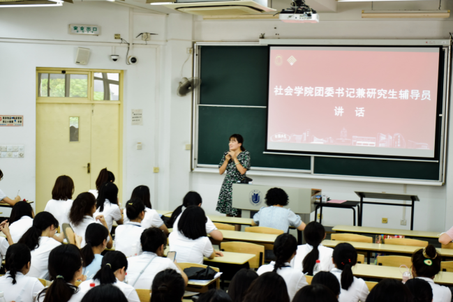 接着,研究生兼职辅导员张钰进行发言,她希望同学们能在善于利用学院资源的基础上,明确研究兴趣,坚定研究方向,并祝福同学们能够在研究生生涯中不负青春、不留遗憾。