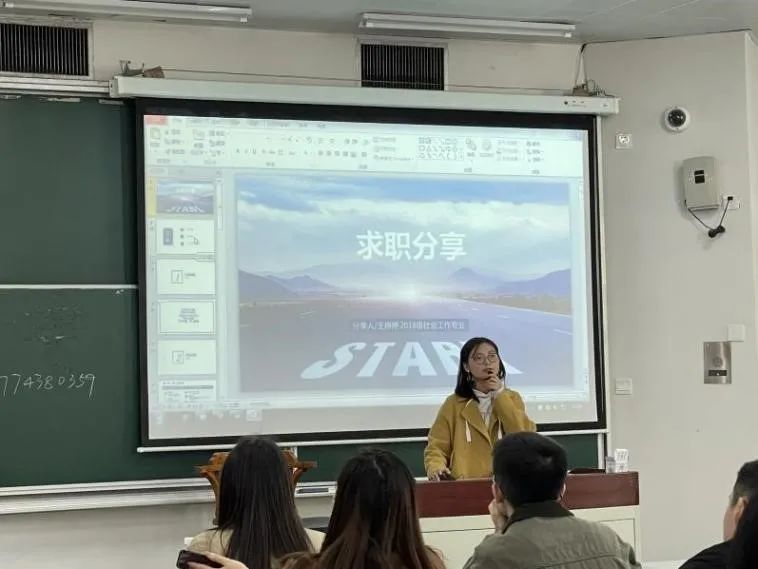 分享环节中,就职于中国平安人寿保险股份有限公司(总部)的王婷婷学姐详细地向同学们介绍了自己的求职经历与求职经验。在简历投递与面试准备的介绍中,学姐表示,简历需用心打磨并采取“多投”的方式才能让录取成功率变大;而面试则要善于使用“知己知彼”的思路方能获胜。想清楚、择行业、选职业、立目标、踏实干是王婷婷学姐寄语同学们的求职秘诀。