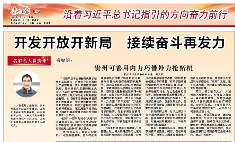 长期深耕上海,对以上海为中心开展大数据科学与都市发展分析、基层治理创新研究的盛智明来说,对贵州如何善用内力,巧借外力抢新机娓娓道来——
