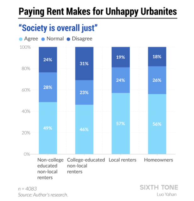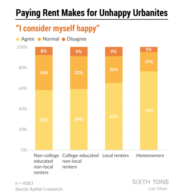 In our research, my team found that, under China’s current rental market conditions and household registration policies, whether or not young people own a house is an important indicator of their happiness and their perceptions of social justice. Among homeowners, for instance, 77% of respondents described themselves as “happy” — nearly 20 percentage points higher than non-local renters. Homeowners reported overall satisfaction levels 24 percentage points higher than non-local renters.