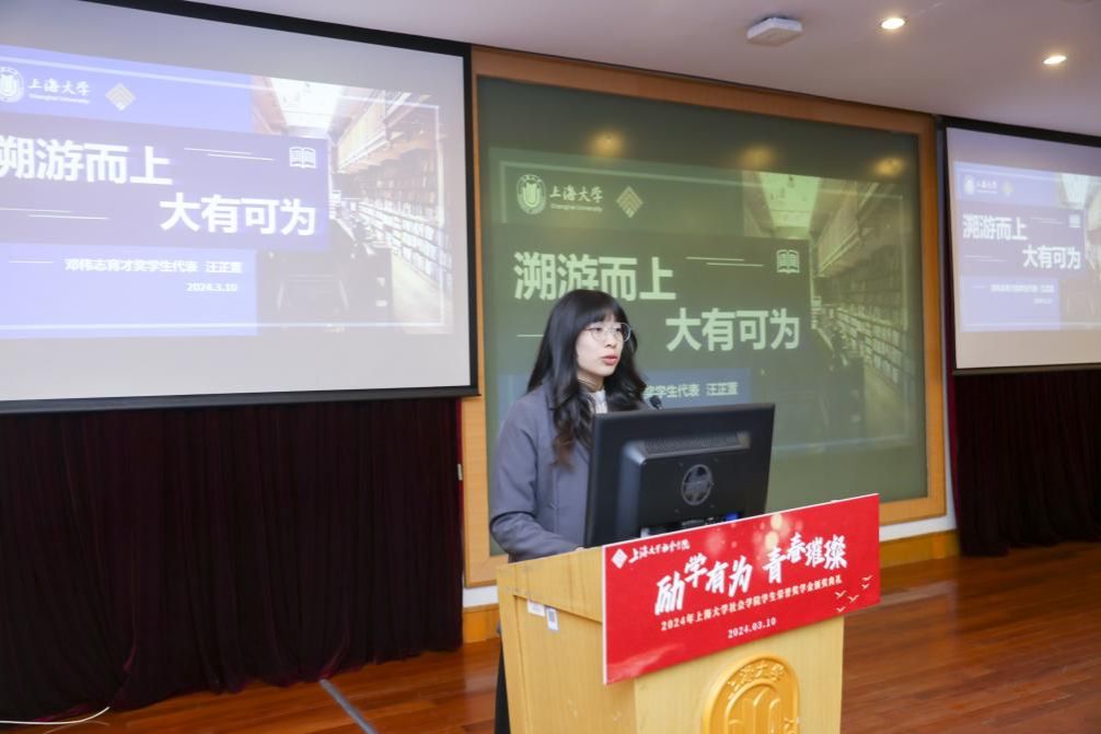 在热烈隆重的颁奖仪式后,郑沅芷、汪芷萱、吕思颖三位同学作为获奖学生代表依次上台分享。郑沅芷同学谈到,真正的社会学来源于自己的生活,要努力构筑自己的精神世界,用社会学的想象力激发和反思社会问题,从中找到个人成长的力量。汪芷萱同学紧扣自身经验,向同学们建议社会学人不仅要有“千里眼”,更要深耕学业,“知书”而后“达礼”,用社会学之“矢”,去射社会问题之“的”。吕思颖同学从人口学学习过程中的具体学习经验和论文发表步骤出发,深入讲述了应当如何积攒自己的科研“小目标”。
