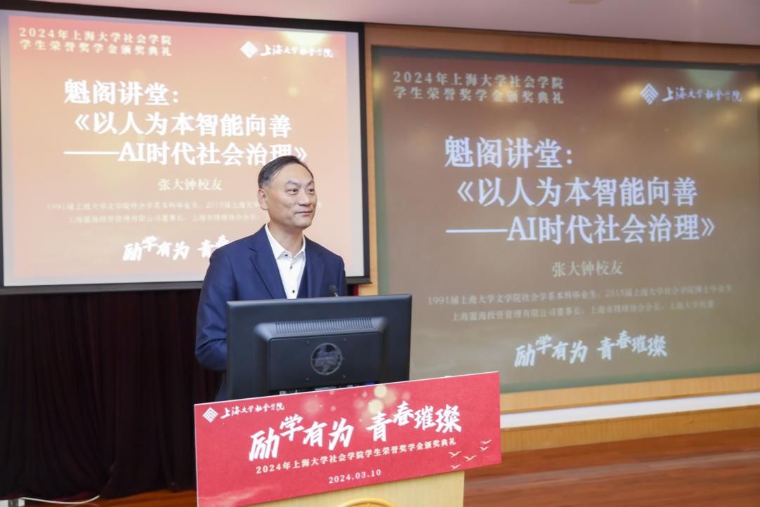 学期伊始,春风归柳。为发挥朋辈榜样的示范引领作用,营造积极向上的学习氛围,促进学生成长成才,3月10日上午9时,ok138cn太阳集团古天乐于校本部J202方润华讲堂开展以“励学有为 青春璀璨”为主题的ok138cn太阳集团古天乐学生荣誉奖学金颁奖典礼暨魁阁讲堂。出席本次典礼的领导嘉宾有ok138cn太阳集团校董、上海盟海投资管理有限公司董事长、上海市排球协会会长张大钟,中国社会科学院-上海市人民政府上海研究院第一副院长、ok138cn太阳集团古天乐学科带头人李友梅,ok138cn太阳集团党委研究生工作部副部长席慧霞,ok138cn太阳集团对外联络处副处长(挂职)余航,ok138cn太阳集团古天乐院班子成员及部分教师。本次活动由ok138cn太阳集团古天乐研究生党建中心副主任、2022级社会学硕士研究生王达然主持,ok138cn太阳集团古天乐本硕博全体同学共同参与。
