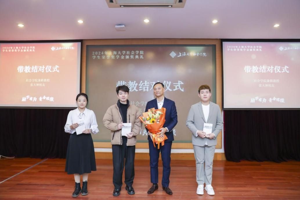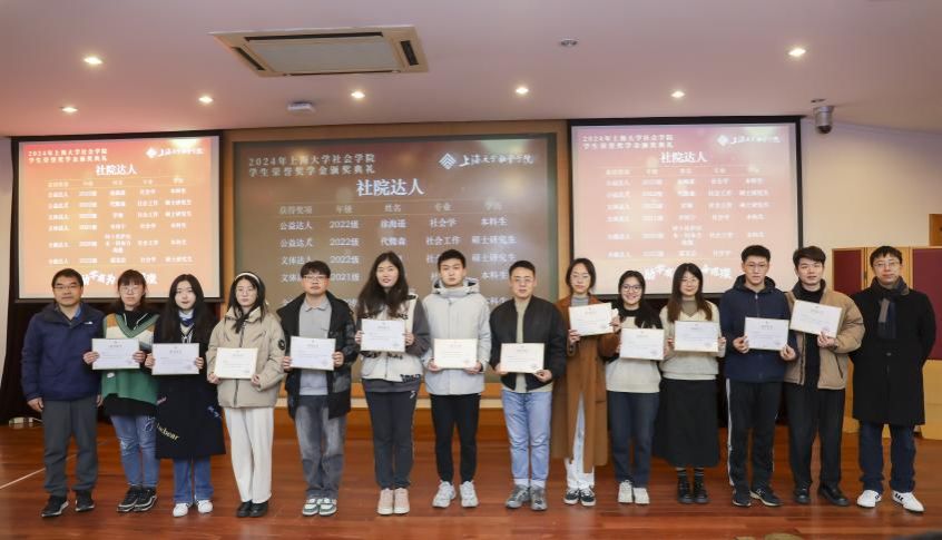 盛智明、李朔严两位老师为袁方杰、周之叶、沈余飞、顾思泽等12位同学颁发“社院达人”荣誉证书