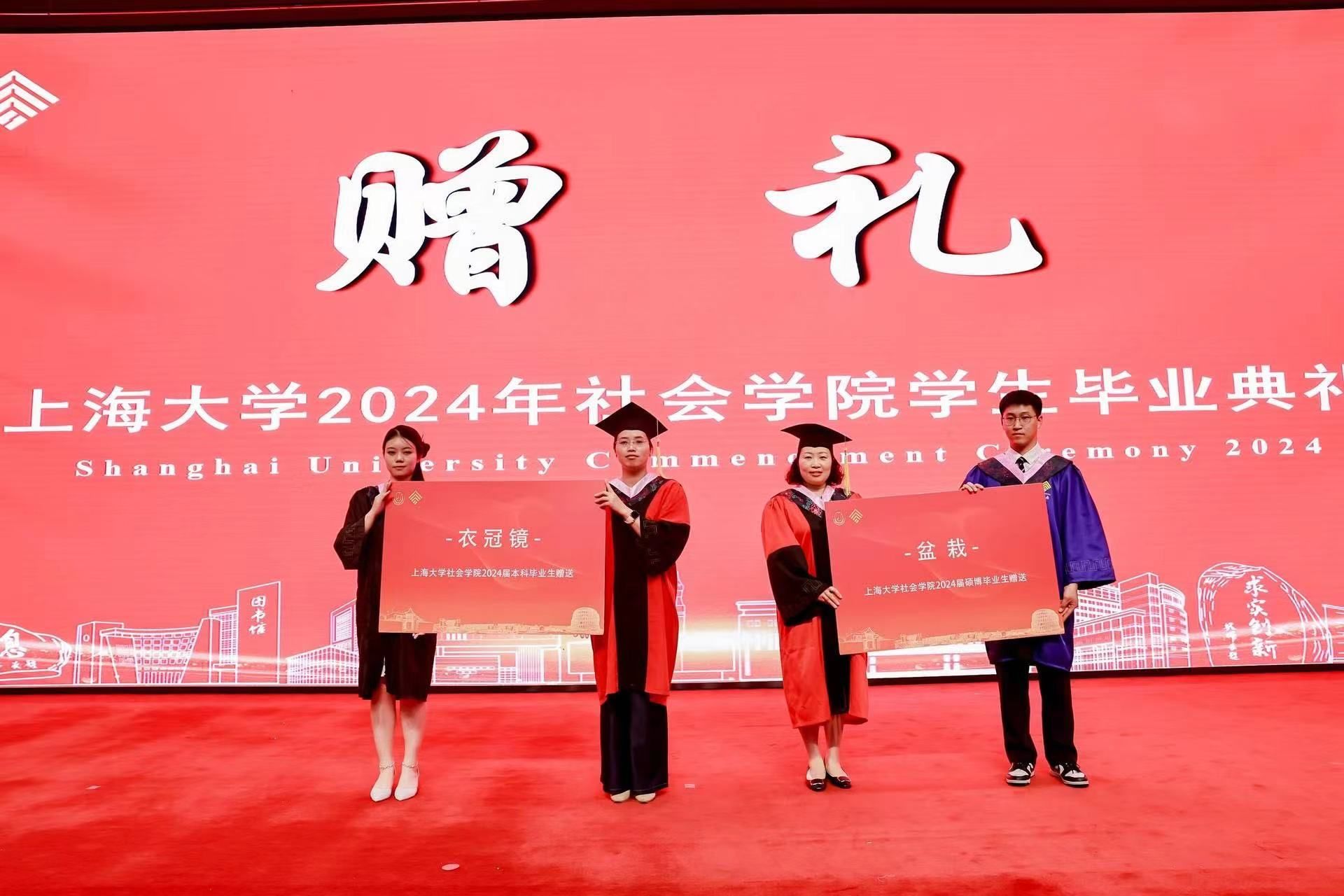 本科毕业生廖雨、硕士毕业生代腾森作为学生代表向学院赠送礼物,ok138cn太阳集团古天乐党委副书记、副院长张乃琴老师与副院长纪莺莺老师代表学院接受赠礼。礼物虽小,承载的却是同学们对学院真挚的情意,记录下的是2024届毕业生与社院之间独一无二的缘分。