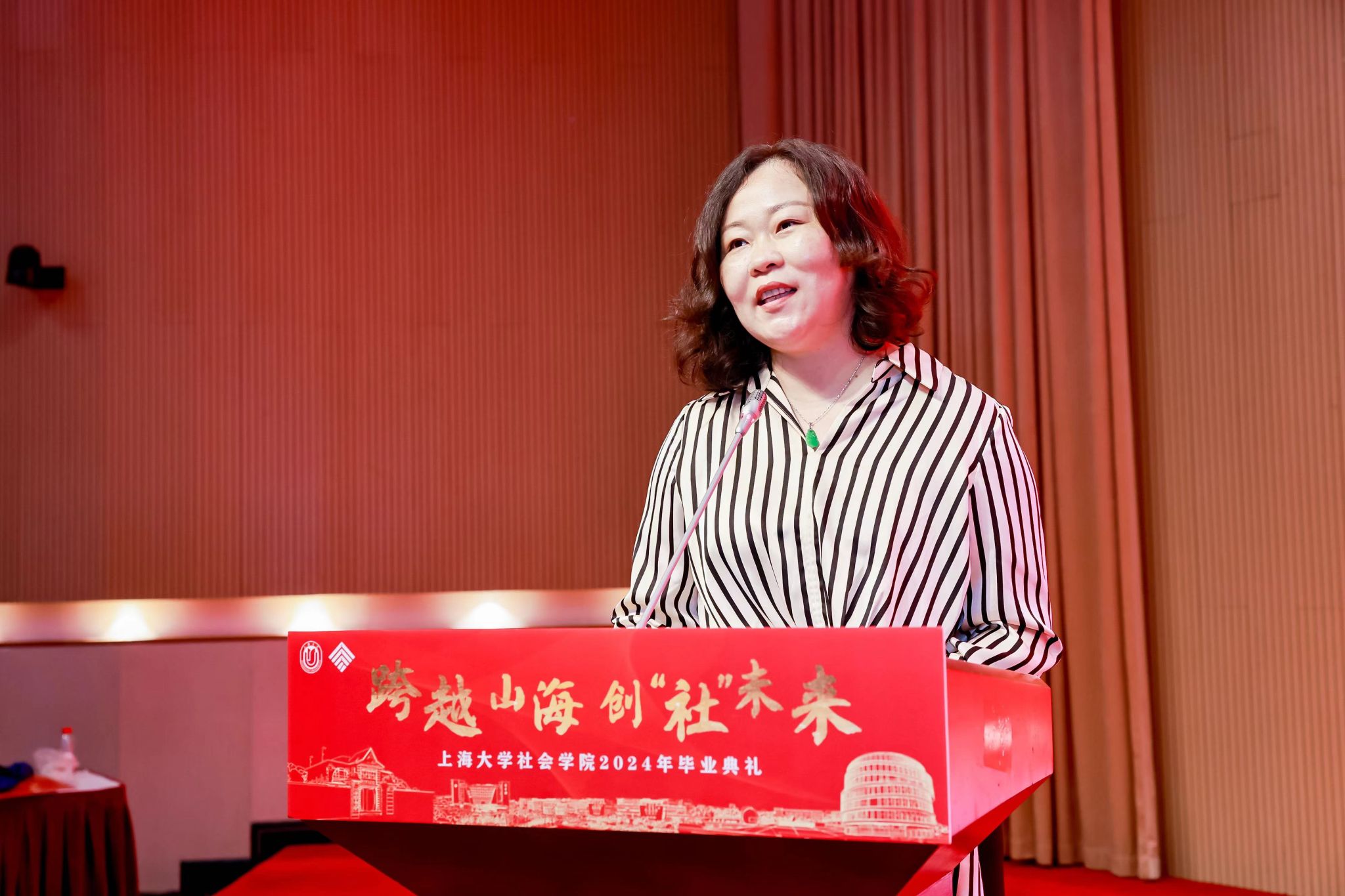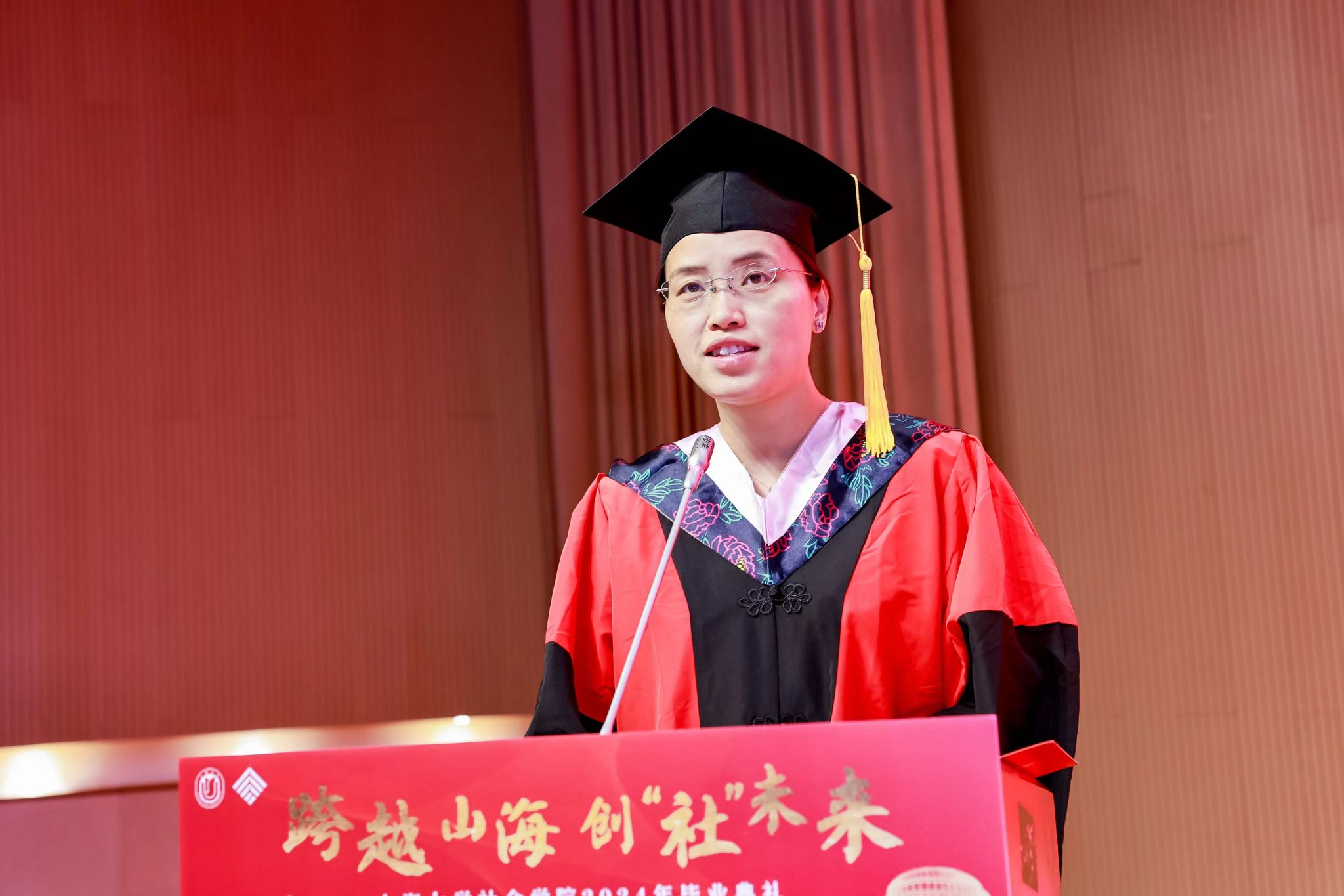 计迎春老师作为教师代表上台发言。她以“把握自己的节奏,定义自己的人生”为题,指出这一届毕业生的特点是:向上对齐,向下拓展。无论是在学校里还是职场中,我们每时每刻都在进行着“内卷”。作为社会学人,我们应当认识到这不仅仅是我们自身所造成的结果,更是由社会制度、经济下行等因素共同造成的。这种双重内卷可能造就个人的“成功”,可能造就大家的“躺平”,但更多的却是给大众制造焦虑。所以,我们更要在当下浮躁的世界中坦然面对一切,要在多元化的基础上形成共识,成为有灵魂的人;我们要决定工作的模式,创造属于自己的美丽新世界;我们要给彼此爱与希望,有前进的动力,过有意义的人生。这样,我们的未来必定可期!