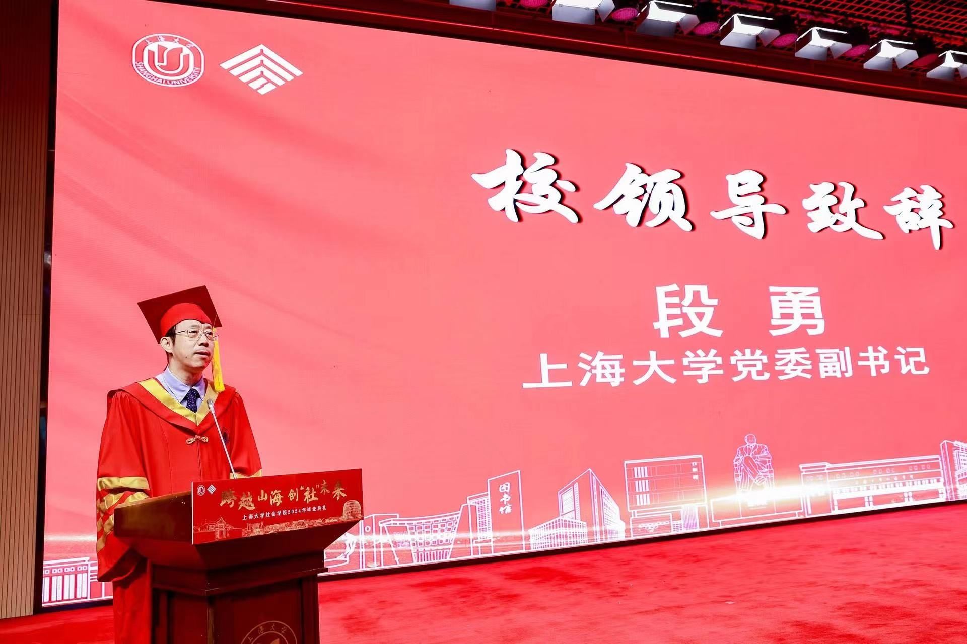 典礼伊始,校党委副书记段勇上台致辞。他表示,毕业年年情相似,年年毕业人不同。今年毕业的同学大多出生于2000年后,是中国发展进入新里程的标志性年份。新世纪里,我们已共同走过穷困,迎来繁荣。如今,生在国旗下,长在春风里的新一届毕业生们完成了又一个人生中重要的阶段,对此,他表示了衷心的祝贺。同时希望大家在面对未来学业和就业的茫然时不忘初心,相信未来。保持善良、豪情万丈的情怀,充实身心,提高自己。他指出,在今后的人生道路上,希望大家能从上大的历史中汲取养分,让那些闪耀在历史中的人物和事迹成为支持同学们的榜样,成为指引我们人生的重要力量。