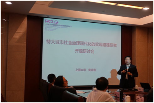 在毛丹教授的主持下,课题首席专家黄晓春教授向与会领导与专家汇报了研究方案。党的十九届四中全会提出,要“加快推进市域社会治理现代化。推动社会治理和服务重心向基层下移,把更多资源下沉到基层,更好提供精准化、精细化服务。”而在市域治理中,最具挑战性的则是特大城市的社会治理。2014年以来,习近平总书记在上海考察时多次强调,“要走出一条符合特大城市特点和规律的社会治理新路子”。这表明探索新时代特大城市社会治理现代化之路对于我国国家治理体系和治理能力现代化具有重要意义。近年来,上海、北京、广州等特大城市都展开了一系列重要探索,但总体来看,当前对新型治理模式的实现路径及其支持机制仍着力较少,对改革的微观支持机制缺乏深入探讨。基于这种研究与实践现状,进一步研究特大城市社会治理现代化的具体实现路径就显得极为必要。课题组立足新时代的经济社会发展特征,以特大城市为主要指向,以社会治理现代化为核心线索,以实现路径为主要着力点,更深入聚焦特大城市治理创新的机制性过程,设计了“1+4”的总体研究框架:“1”是聚焦“特大城市社会治理创新的方向与路径”;“4”指的是“党建引领”、“基层政府改革与创新”、“激发社会活力”、“技术治理实现机制”四项重大改革机制研究。课题组希望通过深度剖析现阶段我国特大城市社会治理创新的基本特征和瓶颈问题,推动中观机制分析层次的分析概念、理论框架构建进程,丰富中国特色社会治理研究的知识积累,为中国特大城市构建新型治理模式提供理论和政策支持。
