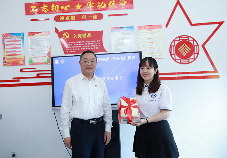 报告结束后,成书记向秋白党支部赠送《共产党宣言》等红色书籍,给支部带来了丰富的学习资源,并鼓励支部党员加强理论学习,学深学透秋白精神。