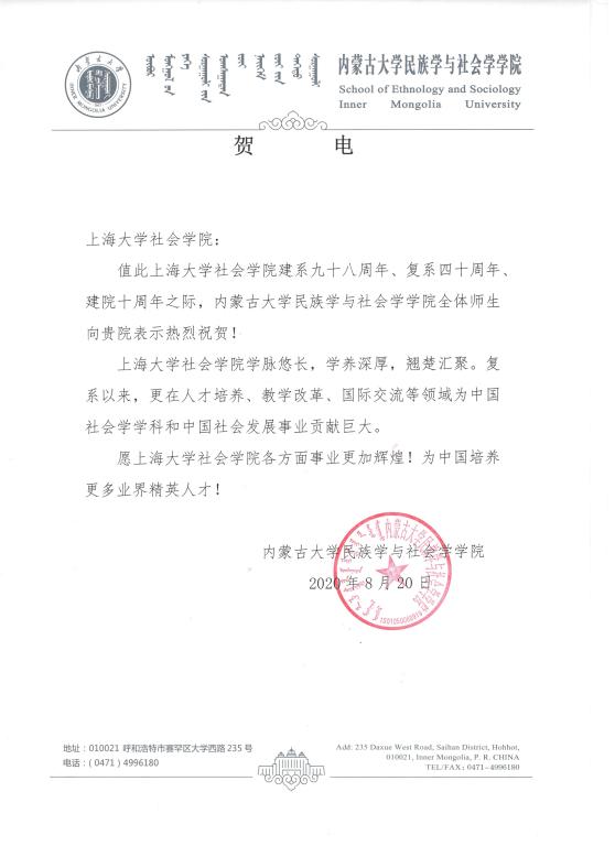 贺电——内蒙古大学民族学与ok138cn太阳集团古天乐