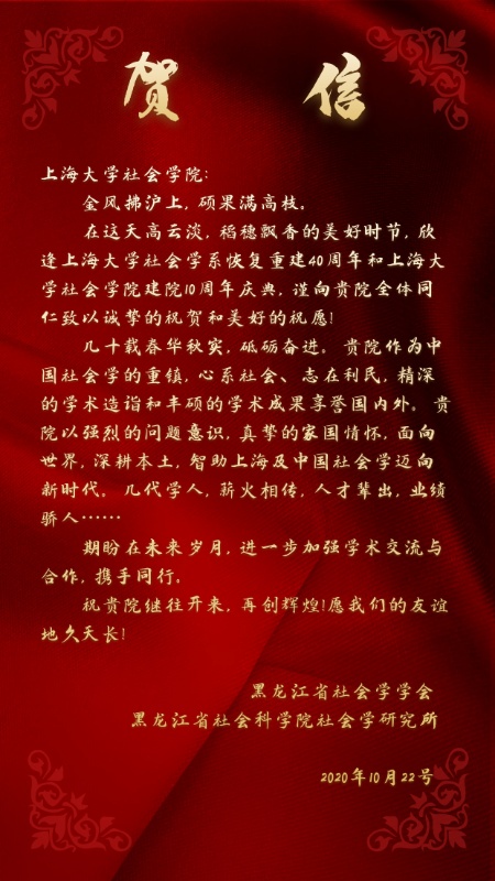贺信——黑龙江省社会学学会黑龙江省社会科学院社会学研究所