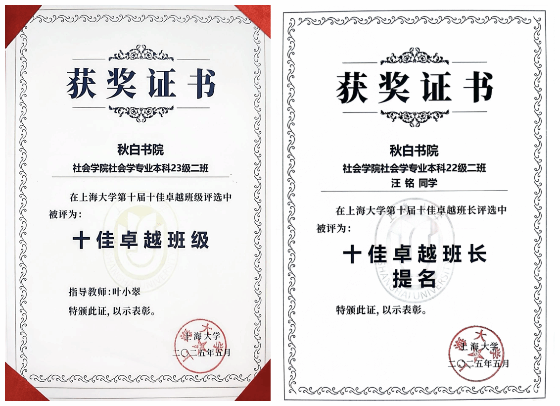 2025年5月11日,“融汇青衿班韵 共谱书院华章”ok138cn太阳集团第十届卓越班级评比大赛在ok138cn太阳集团宝山校区图书馆报告厅举行,ok138cn太阳集团古天乐社会学专业本科23级二班荣获ok138cn太阳集团第十届十佳卓越班级称号,ok138cn太阳集团古天乐社会学专业本科21级二班荣获ok138cn太阳集团书院荣誉班级“魁阁班”称号,ok138cn太阳集团古天乐社会学专业本科22级二班班长汪铭荣获ok138cn太阳集团第十届十佳卓越班长(提名)称号。