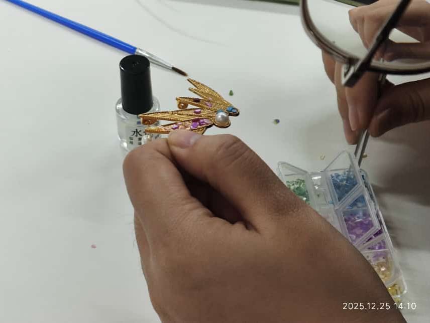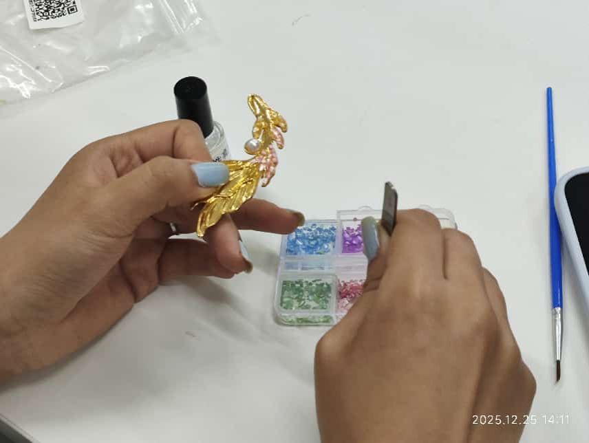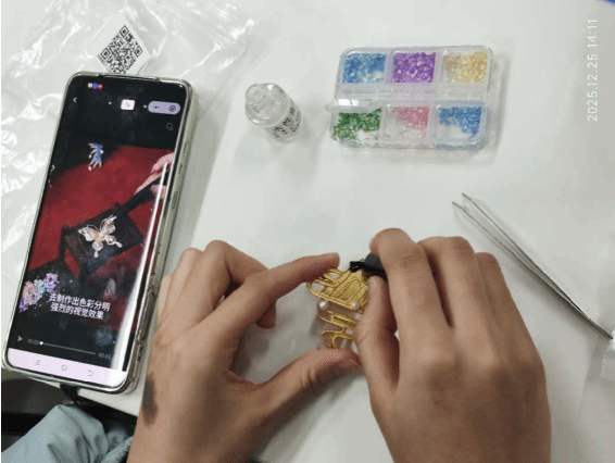 在手工创作环节,同学们纷纷拿起镊子、螺钿片和胸针底坯,或参考传统纹样,或自由发挥创意,开始专注地拼贴属于自己的螺钿作品。活动室内悄然无声,只有轻轻的摆放与粘贴声,大家在细致的手作中逐渐沉静下来,专注于眼前的方寸之美。工作人员在一旁耐心巡回,及时提供技术支持与鼓励,让每一位参与者都能安心创作、享受过程,指尖与螺钿的每一次触碰,仿佛都是一次与自我、与传统的对话。