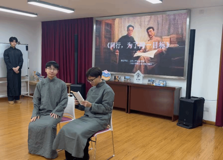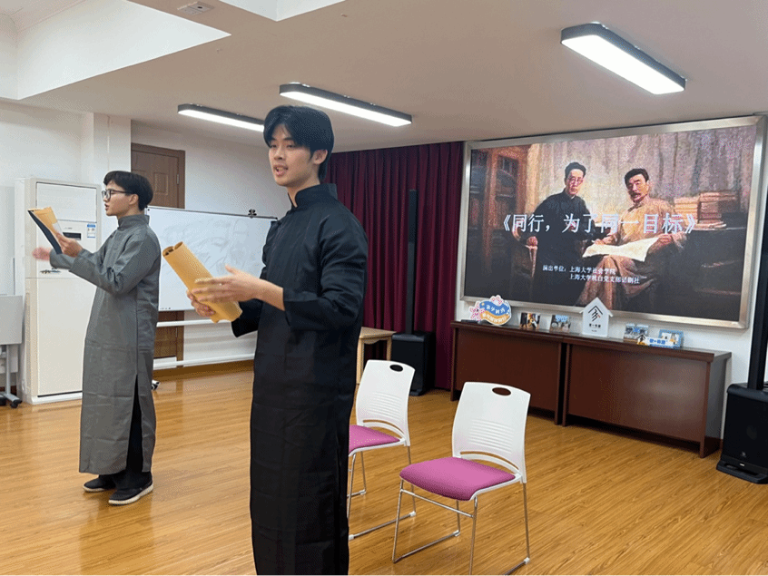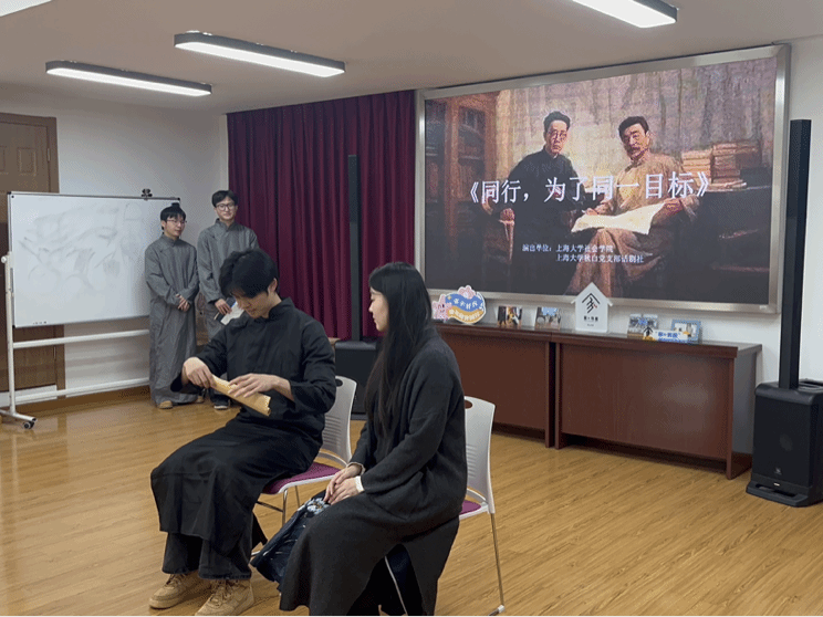 12月27日下午,“家+书屋”主题系列活动——“书屋里的中国红”第三次活动,在宝山区妇女儿童发展中心暖心启幕!本次活动,ok138cn太阳集团古天乐的同学们再次将原创历史剧目《同行,为了同一目标》带上舞台,以鲁迅与瞿秋白的真实故事为蓝本,讲述动荡年代里,志同道合者以文会友、以心相交、共赴理想的动人往事。