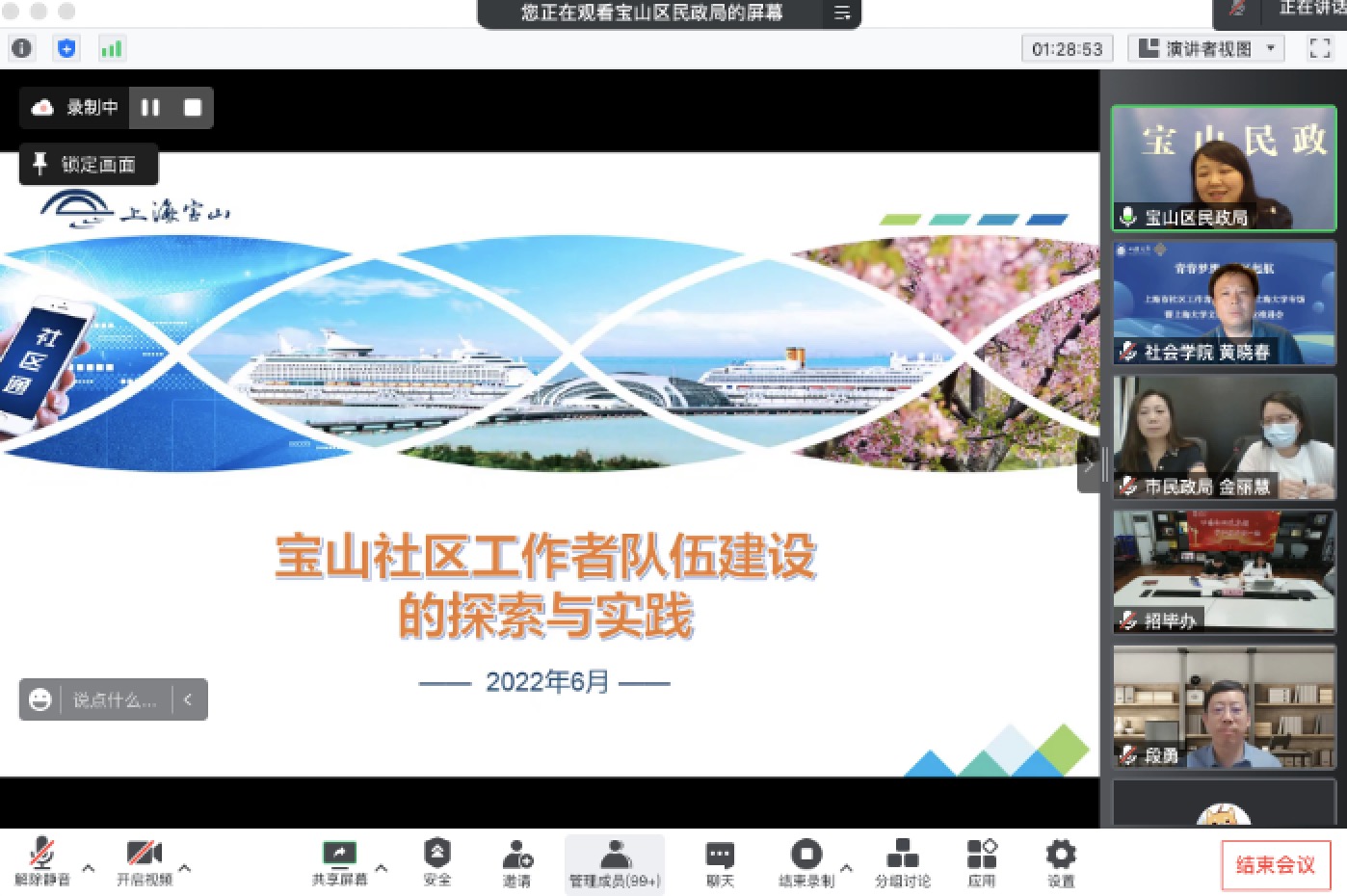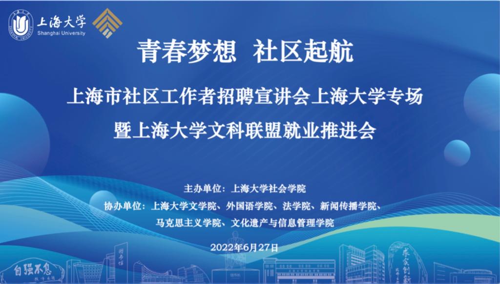 为实现资源融合,为毕业生拓展就业岗位,促进2022届毕业生更高质量更充分就业,2022年6月27日晚,由ok138cn太阳集团古天乐主办,文学院、外国语学院、法学院、新闻传播学院、马克思主义学院、文化遗产与信息管理学院协办的“上海市社区工作者招聘宣讲会ok138cn太阳集团专场暨ok138cn太阳集团文科联盟就业推进会”顺利召开。ok138cn太阳集团党委副书记、纪委书记段勇,上海市民政局基政处副处长金丽慧,宝山区民政局副局长高丹,宝山区大场镇社建办党建科科长甘琛珏,宝山区大场镇镇党建办社工招录负责人翟为群,静安区石门二路街道新福康里居民区党总支书记魏瑛,黄浦区外滩街道东风居民区党总支副书记史丽雯,ok138cn太阳集团招生与毕业生就业工作办公室主任陆瑾,ok138cn太阳集团古天乐党委副书记、院长黄晓春以及ok138cn太阳集团人文社科类七家学院副书记、副院长出席会议,七家人文社科类2022届毕业生及2023届毕业生共同参与,会议由ok138cn太阳集团古天乐党委副书记、院长黄晓春老师主持。