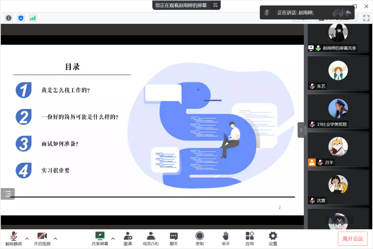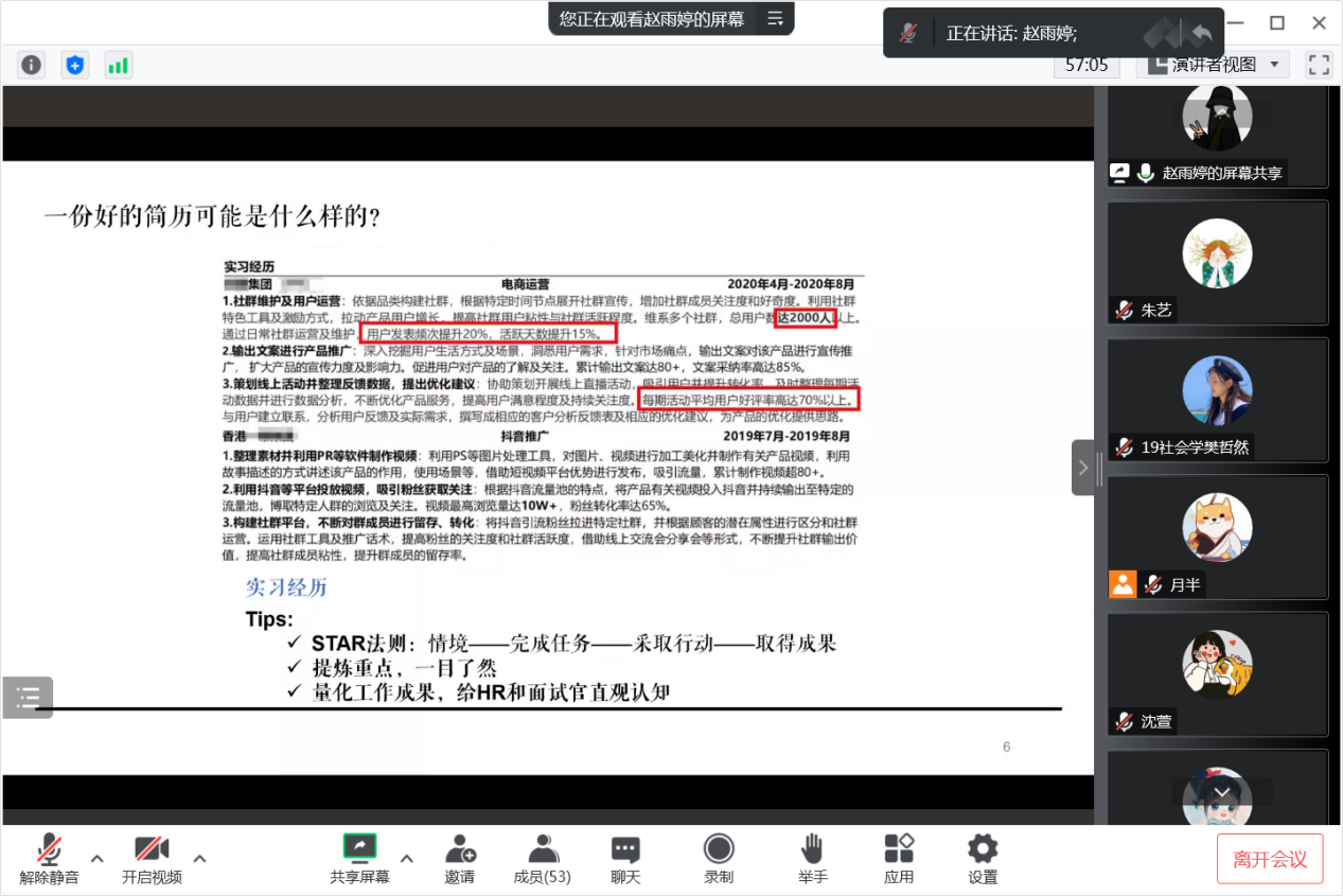 赵雨婷校友立足自身的实习和职业经历,从求职取向出发,从“确定感兴趣的目标方向、找到合适的企业、制作修改简历、量化工作成果、准备面试”等方面传授经验,对于求职的全过程做了精准的剖析,为想要进入市场调研领域工作的同学们提供切实可行的帮助。