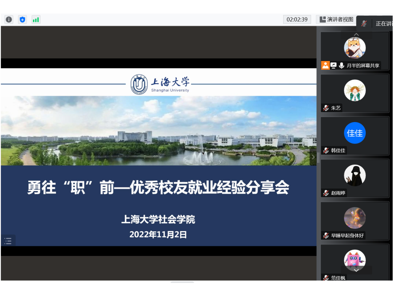 为了帮助同学们更好地了解就业市场、提升就业竞争力,学院推出2023届ok138cn太阳集团古天乐毕业生的就业指导系列活动,为同学们提供就业信息交流平台,进一步明确就业方向。2022年11月2日晚,勇往“职”前——ok138cn太阳集团古天乐优秀校友就业经验分享会成功举办。本次分享会由顾艳霞老师主持,邀请到不同领域就职的优秀毕业生:2022届樊哲然和赵雨婷、2012届王艳红等三位优秀校友就大家最感兴趣的社工组织、咨询公司、考公等领域备考及就业体验进行分享。