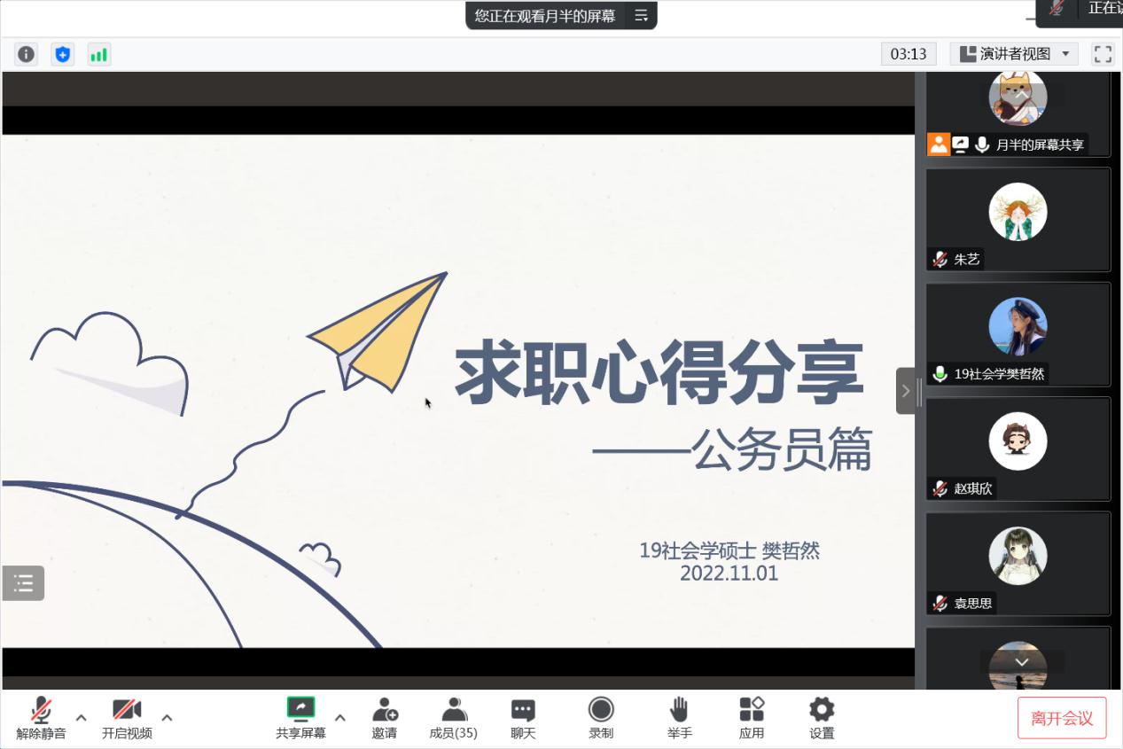 樊哲然校友向学弟学妹们讲述了自己的考公历程。她前后参加国考、上海市考、河南省考、选调等多次公务员考试,从匹配报考条件、考试信息收集、学习内容、资料推荐等方面,详细讲解选岗经验和备考流程;尤其重点梳理上海市考的考试时间轴,同时强调要进行重点突破,发挥自己的专业优势,提升备考效率。