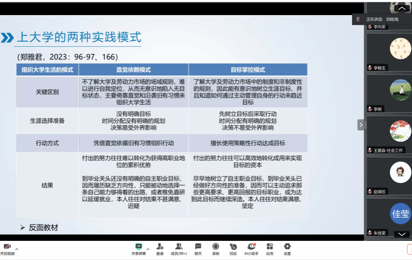 第三位主讲人是2024届社会学专业的研究生刘铭鸿同学,现已获得深圳华润三九offer。刘铭鸿同学以生动形象的讲述方式,为同学们详细解读了如何选择职业、如何寻找实习机会以及如何在实习中学习和成长。他着重强调了要在实习中主动学习、拜师学艺,并及时梳理、总结经验,为后续的求职之路奠定基石。
