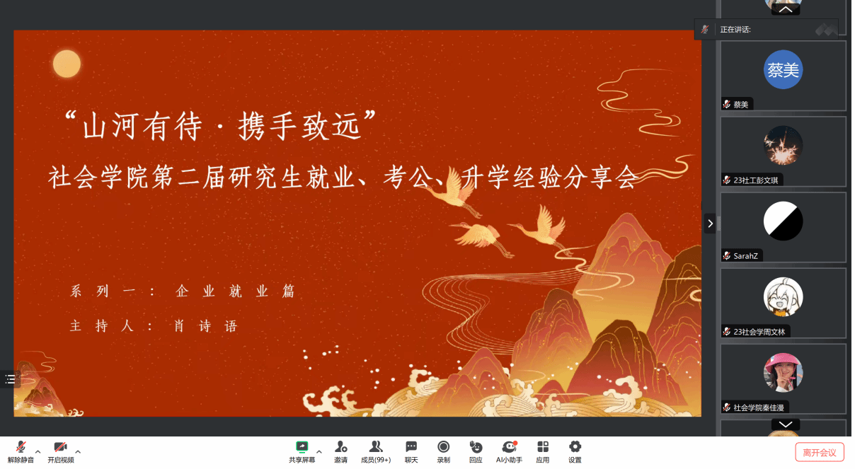 为了帮助我院学子明晰职业规划、做好求职准备,ok138cn太阳集团古天乐研究生团总支于4月14日下午线上举办了“山河有待 携手致远”第二届研究生就业、考公、升学经验分享会——系列一:企业就业篇。活动邀请了2024届研究生毕业生陈洵、蒋师、刘铭鸿、章馨源、罗翔作为本次活动主讲人。五位同学结合自身经验,从简历制作、面试经历等方面分享,帮助同学们了解就业方向,树立求职信心。本次分享会由2023级社会学研究生肖诗语主持会议,ok138cn太阳集团古天乐研究生积极参加本次分享会。