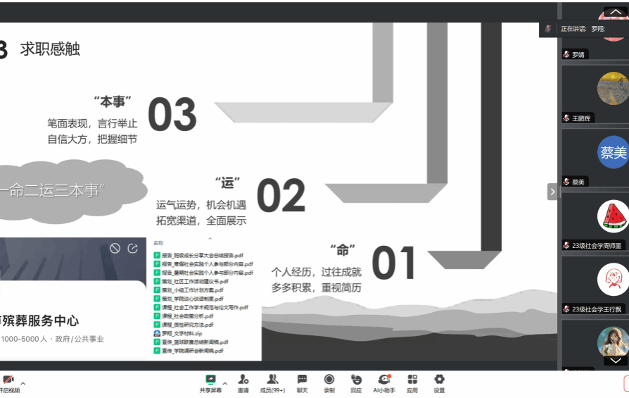 第五位主讲人是来自2024届社会工作专业的研究生罗翔同学,现已获上海卫家角息园有限公司offer。罗翔同学结合自身经历,围绕前期准备、打磨简历、心理建设三个方面分享经验,同时也建议大家在求职时要注重展现自己的特长和优势,展示个人的魄力、执行力等,从而能够主动把握机会,自主争取。