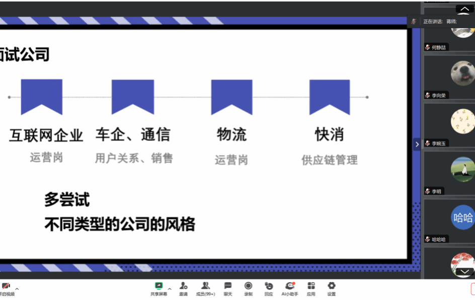 第二位主讲人是2024届社会学专业的研究生蒋师同学,现已获得拼多多的offer并担任运营一职。她重点分享了如何根据未来规划寻找合适的实习机会,并在撰写简历时如何突出自己的优势和特点。蒋师同学鼓励大家在实习中不断学习,多尝试不同类型的公司风格,以丰富自己的职业经验,确立未来的就业目标。