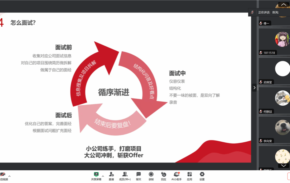 第一位主讲人是2024届社会学专业的研究生陈洵同学,现已获得京东的offer。陈洵同学从如何找实习、找工作、准备校招以及面试技巧等多个方面进行了详细的分享。他强调了简历在求职中的重要性,指导同学们优化简历的技巧与方法,并分享了自己在求职时的经验和心得。同时,他还就如何准备校招、如何提升面试技巧等方面给出了具体的建议。