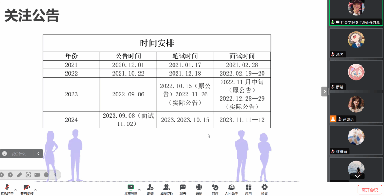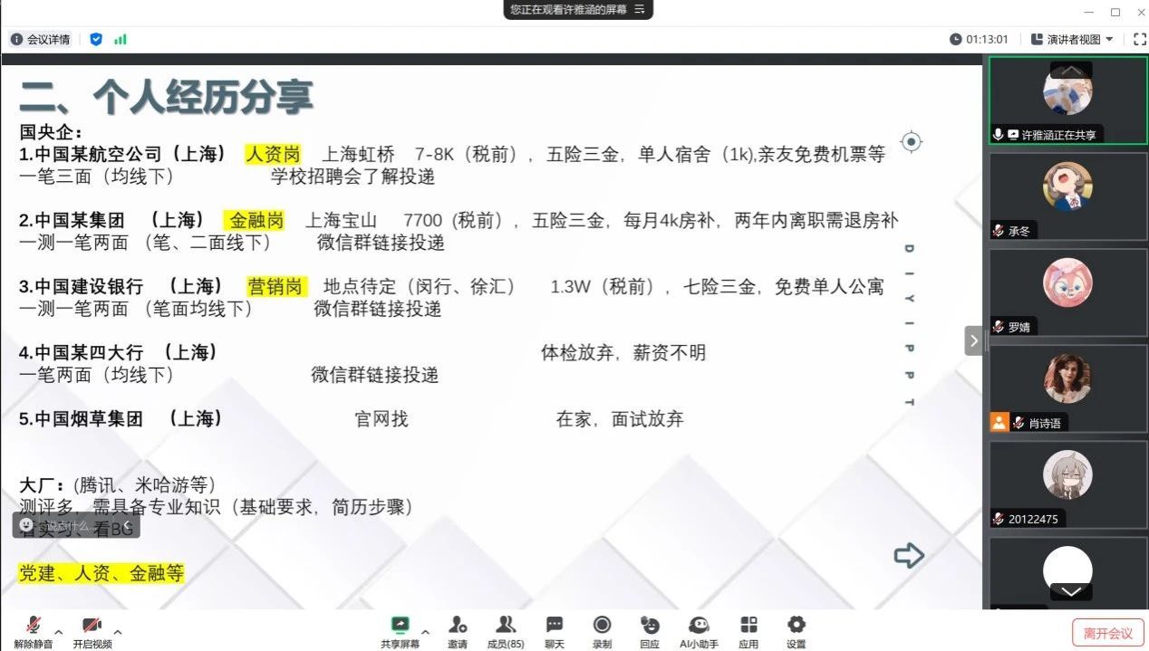 第三位主讲人是2024届社会工作专业的研究生许雅涵同学,现已获得中国建设银行offer。许雅涵同学以生动形象的讲述方式,为同学们详细解读了不同领域、不同性质岗位的薪资,面试技巧和经验等。此外,许雅涵同学还介绍了行测和面试的一些细节和其他注意要点。