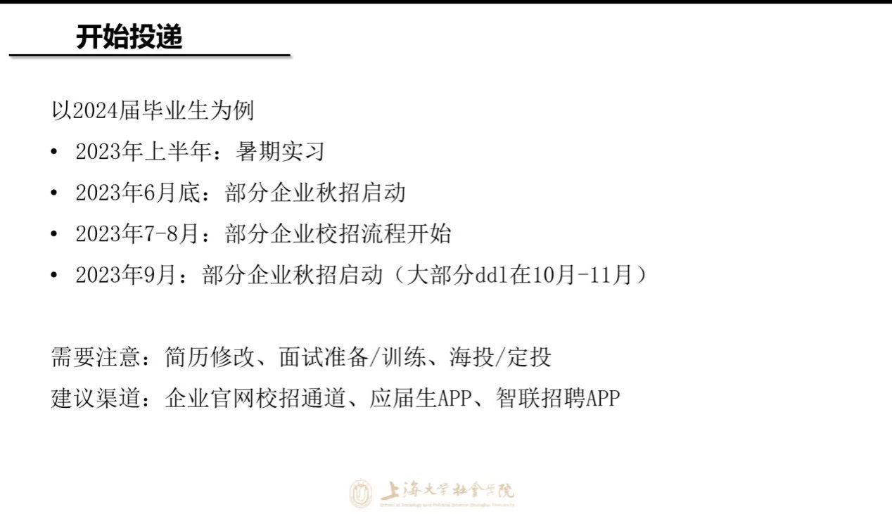 第一位主讲人是2024届社会学专业的研究生赵子静同学,现已获得某外企制造业岗位的管培生offer。在分享中赵子静同学提到,在进行职业规划时,应首先考虑个人兴趣,并综合考虑岗位、企业性质、行业和岗位性质等确定职业规划路径。此外,赵子静同学还分享了自己的求职策略以及实习、参与秋招以及投递简历的时间节点,还就如何提升面试技巧等方面给出了具体的建议。