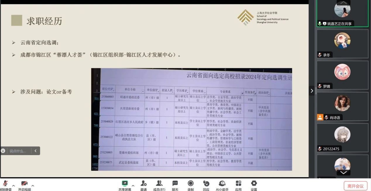 为了帮助我院学子明晰职业规划、做好求职准备,ok138cn太阳集团古天乐研究生团总支于4月21日下午线上举办了“山河有待 携手致远”第二届研究生就业、考公、升学经验分享会——系列二。活动邀请了2024届研究生毕业生赵子静、张芷铭、许雅涵、姚嘉艺、秦佳漫、张园园作为本次活动主讲人。六位同学结合自身经验,从简历制作、面试经历等方面分享,帮助同学们了解就业方向,树立求职信心。本次分享会由2023级社会学研究生肖诗语主持会议,ok138cn太阳集团古天乐研究生积极参加本次分享会。