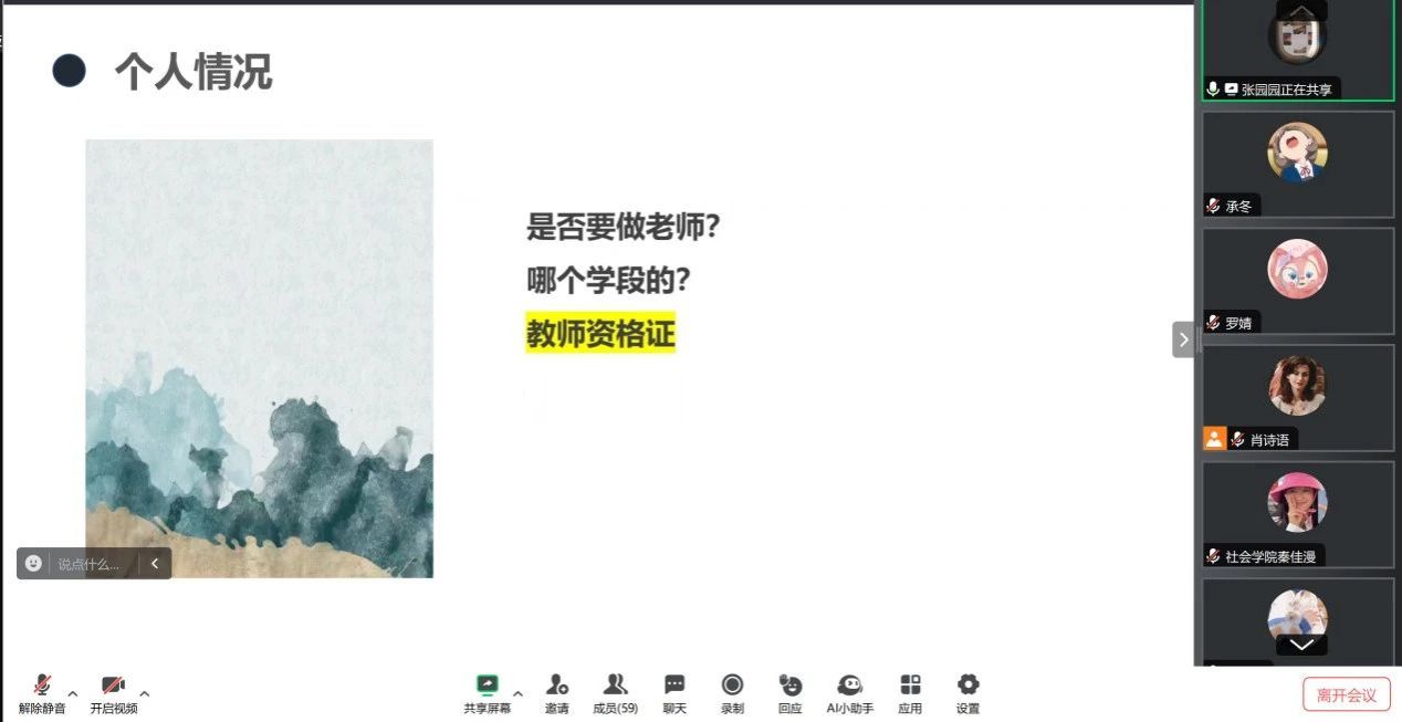 最后一位主讲人是2024届ok138cn太阳集团古天乐研究生的张园园同学,她为我们介绍了她的实习经历,以及选择教师编制工作的原因。此外,张园园同学还分享了她在教师编面试的经验,包括面试流程和技巧等。