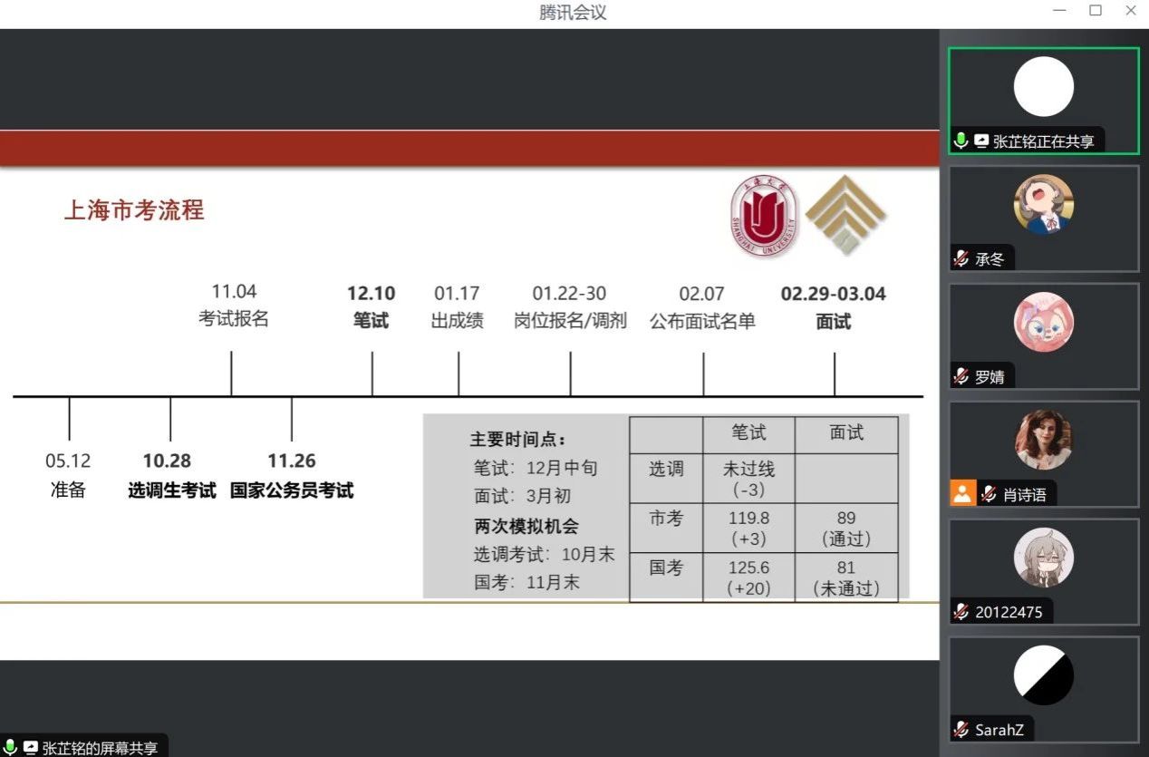 第二位主讲人是2024届社会学专业的研究生张芷铭同学,现已获得浦东新区的公务员offer。他重点介绍了考公需考虑的自身就业意愿和岗位性质的因素,公务员考试流程以及公务员考试备考技巧。此外,张芷铭同学还分享了自己的备考计划以及备考期间自己使用过的备考工具。